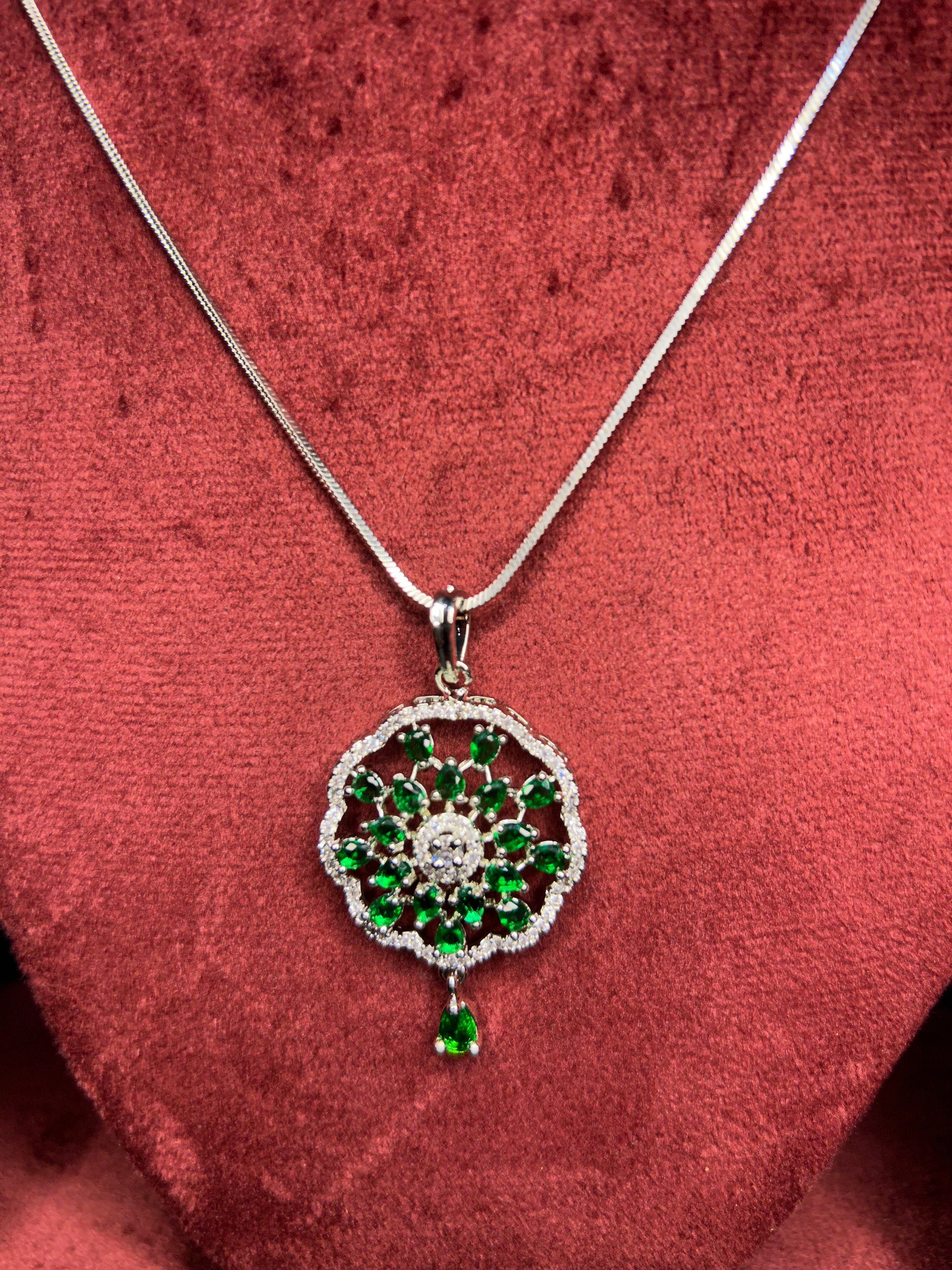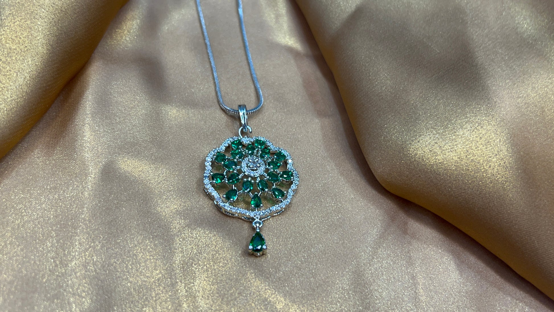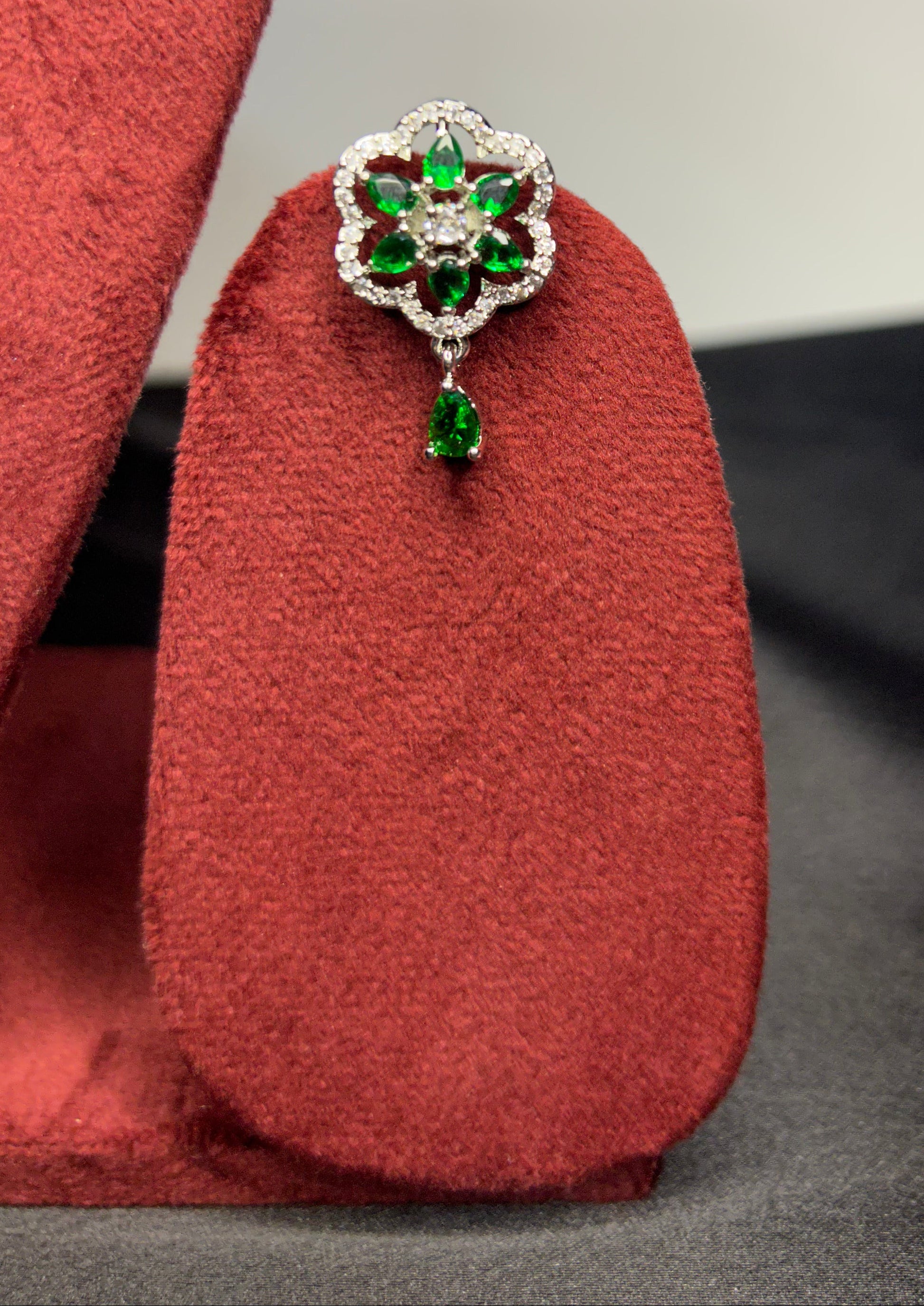 Add a refreshing touch of elegance to your jewelry collection with this Elegant Green Floral Crystal Necklace Set, designed to sparkle with timeless charm. Featuring a beautifully detailed floral pendant adorned with rich green crystals and shimmering clear stones, this set includes a matching pair of earrings with delicate drop detailing for a perfectly coordinated look.