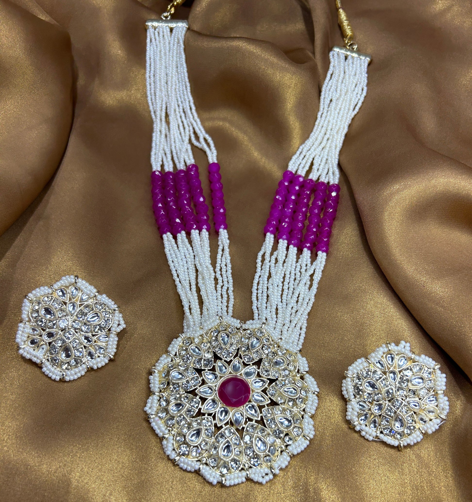 Elevate your ethnic look with this elegant pearl and kundan style necklace set, designed with multiple strands of delicate white seed pearls and striking magenta bead accents. The highlight of the set is a beautifully crafted floral-inspired pendant adorned with shimmering kundan-style stones and a bold pink center stone, paired with matching statement earrings.