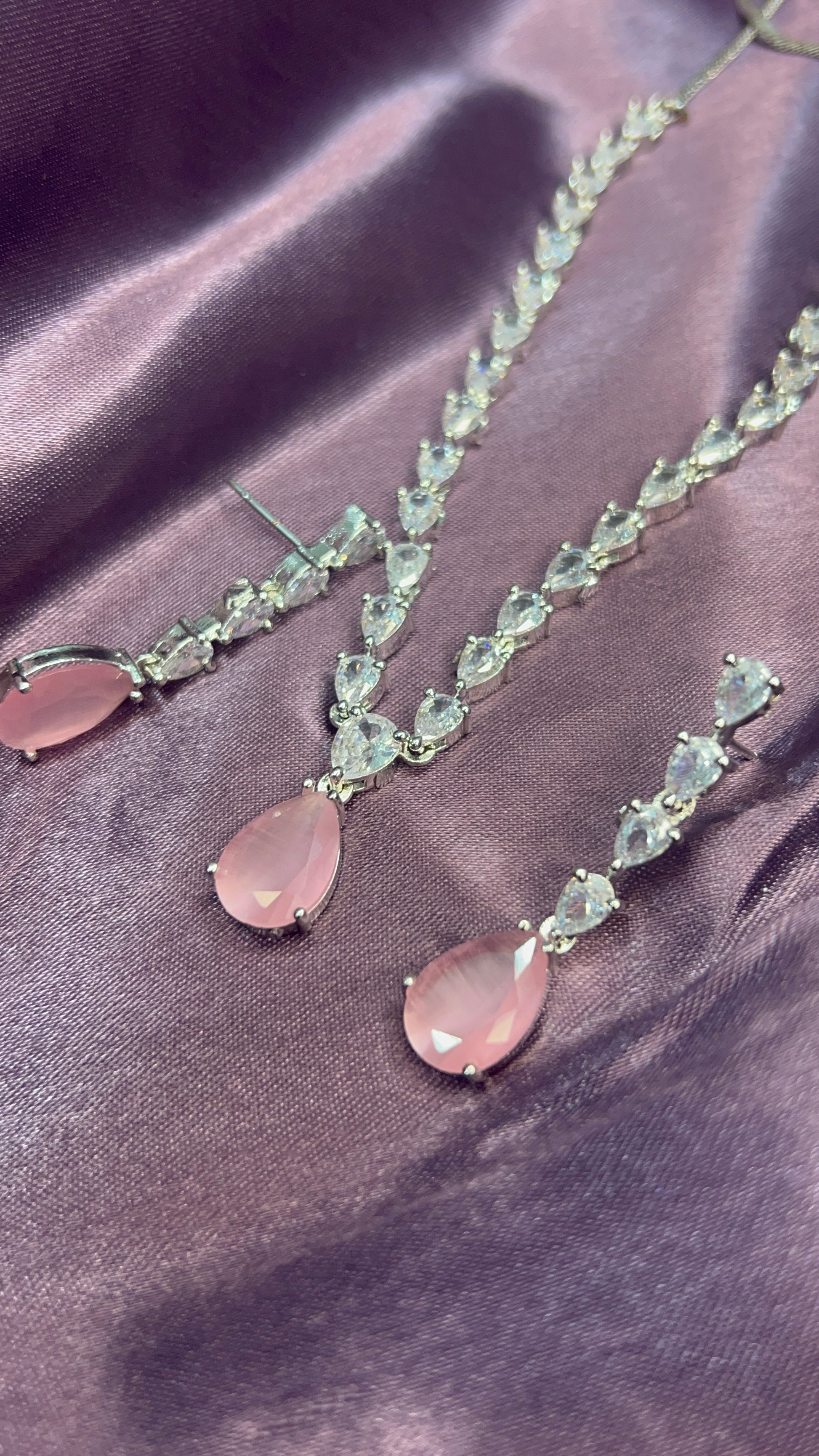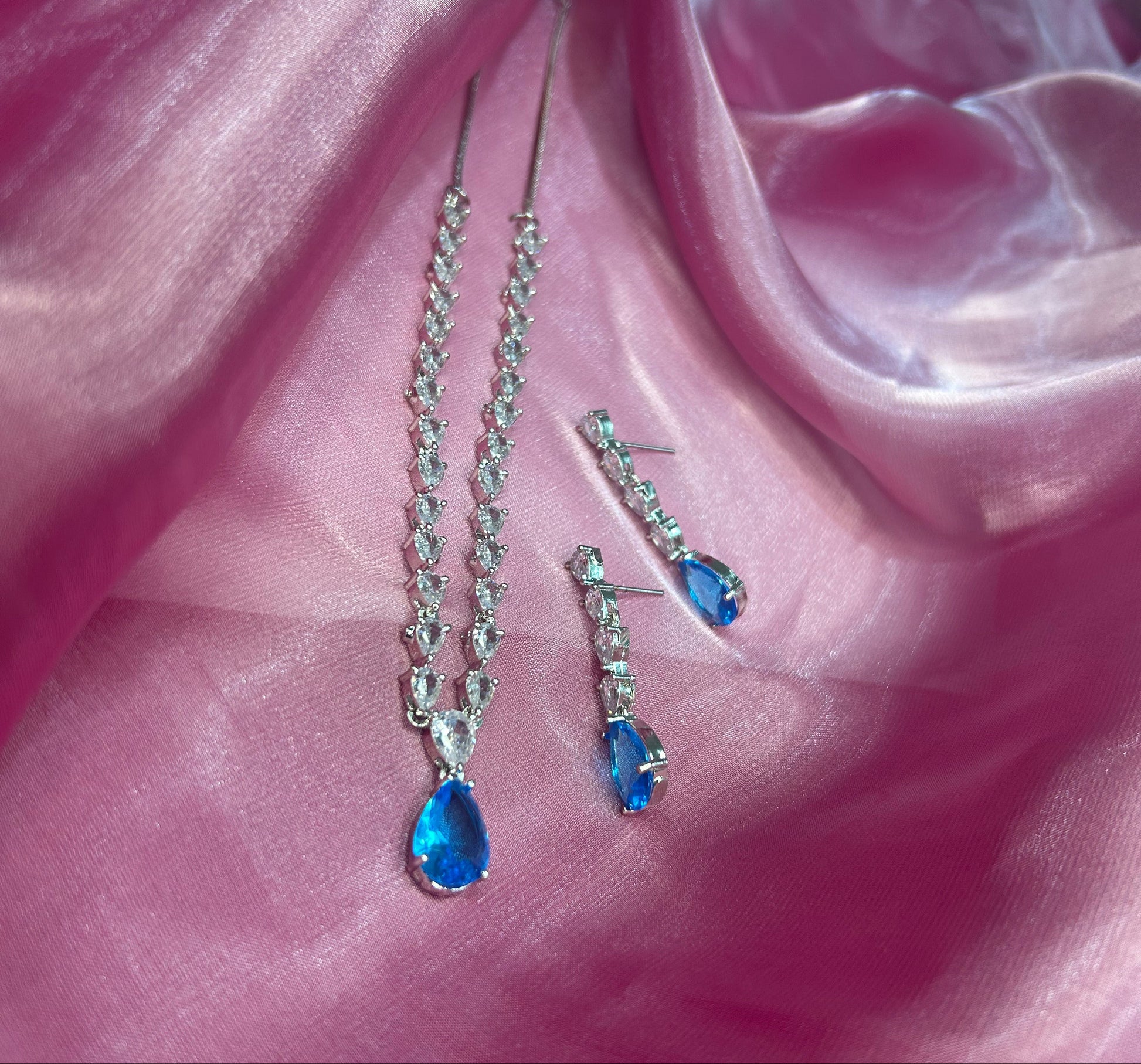 Add a touch of elegance to your look with this timeless crystal drop necklace set, featuring a delicate line of shimmering stones finished with a graceful teardrop pendant. Designed in a sleek silver-tone finish, this minimalist yet luxurious set comes with matching drop earrings, making it perfect for parties, weddings, and evening wear. Available in Sapphire Blue, Soft Pink, and Royal Purple, it effortlessly complements both ethnic and western outfits.